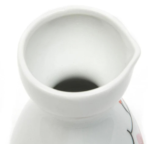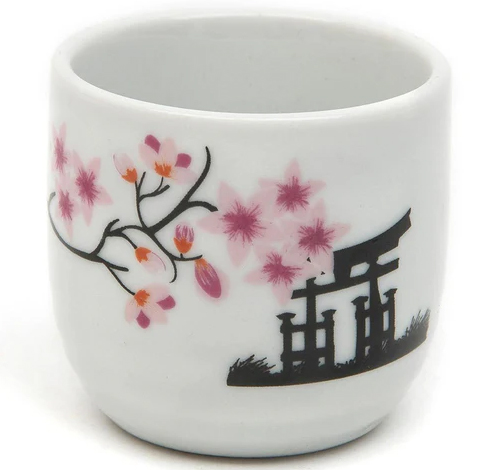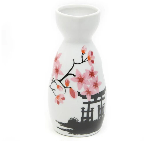 Conjunto de saquê em cerâmica branca com design clássico, composto por uma garrafa (tokkuri) e quatro copos pequenos (choko). As peças apresentam uma estampa delicada de flores de cerejeira (sakura) em tons de rosa e detalhes pretos que remetem a uma silhueta de portão tori e galhos naturais.
