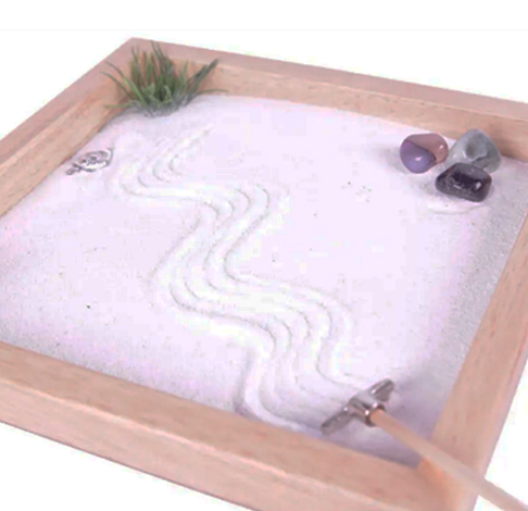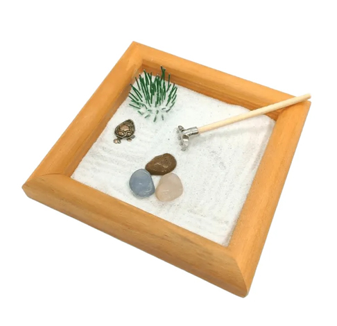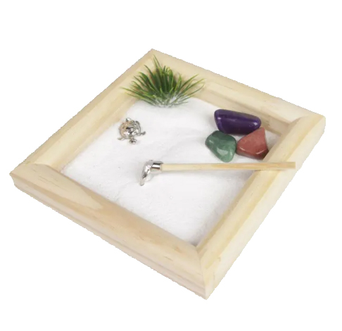 Ao rastelar a areia branca, você cria padrões que simbolizam o movimento das águas, ajudando a organizar os pensamentos e a acalmar a mente após um dia agitado. Perfeito para mesas de escritório, cantos de meditação ou como um objeto de design minimalista que traz harmonia estética e espiritual ao seu espaço.